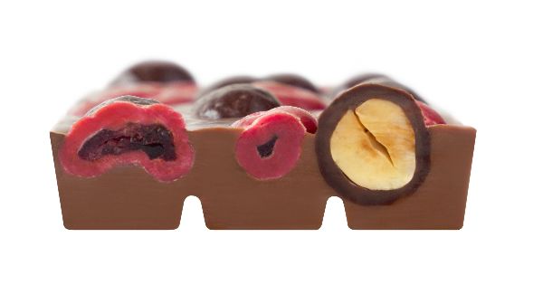 Haferschokolade mit 50% Kakaoanteil aufgepeppt mit zartem Haselnussnougat und bestreut mit fair gehandelten, schonend gerösteten und karamellisierten Haselnüssen, umhüllt von Haselnussnougat und dunkler Schokolade. Farbe ins Spiel bringen getrocknete Cranberries in einer fruchtig-roten Schokohülle aus Preiselbeerkuvertüre. Nussig, fruchtig-frech und völlig vegan.