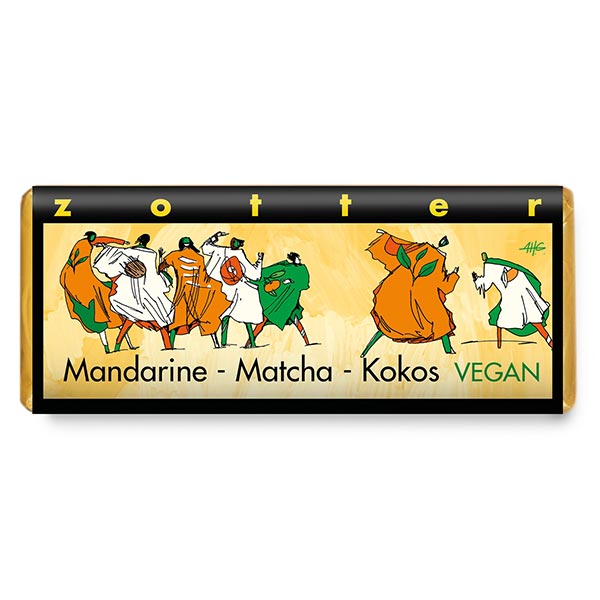 Zutaten: Rohrohrzucker*, Kakaomasse*, Kakaobutter*, Reisdrinkpulver (Reis, Sonnenblumenöl, Salz), Mandarinenkonzentrat (7%), Kokosraspeln*(4%), Kokosmilch (3%), Stärkesirup, Kokosblütenzucker*(3%), Kokosnussöl (2%), Invertzuckersirup, Zitronensaftkonzentrat, Grünteepulver Matcha (0,2%), Geliermittel: Apfelpektin, Vanilleschotenpulver*, Steinsalz, Emulgator: Lecithin (Sonnenblume), Emulgator: Lecithin (SOJA), Orangenöl