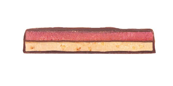 Hafer-Schokolade gefüllt mit einer roten Früchte-Ganache und Mandelnougat mit Fruchtstücken