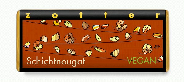 Nobelbitterschokolade gefüllt mit Haselnussnougat, Walnussnougat und Kürbiskernnougat – Wenn Nüsse schmelzen. Eine dunkle Schokolade gefüllt mit drei verschiedenen Nougats. Eine Schicht Haselnussnougat, darauf ein grünes Kürbiskernnougat und schließlich ein zartschmelzendes Walnussnougat. Dieser nussige Klassiker ist komplett vegan.