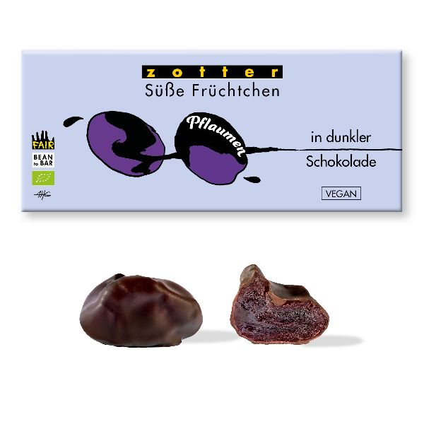 Fein duftende, weiche Pflaumen in dunkler Hülle – ein Klassiker. Perfekt ausbalancierte Süße zwischen Frucht und Schokohülle. Mit selbst gemachter dunkler Schokolade aus Premium-Kakao, reiner Kakaobutter und natürlichem Rohrohrzucker. Edel, fruchtig, klassisch.
