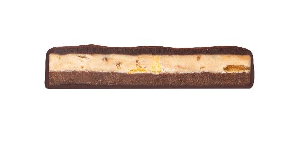 Dunkle Schokolade 70% gefüllt mit Milchschokoladenganache und Cashewnougat verfeinert mit Maracujafruchtstücken und Mandelkrokant
